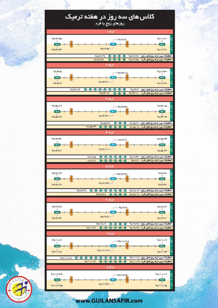 کلاسهای ترمیک سه روز در هفته زوج و یا فرد و هر روز یک جلسه ی نود دقیقه ای برگزار میشوند و ترم در پنج هفته به پایان میرسد.