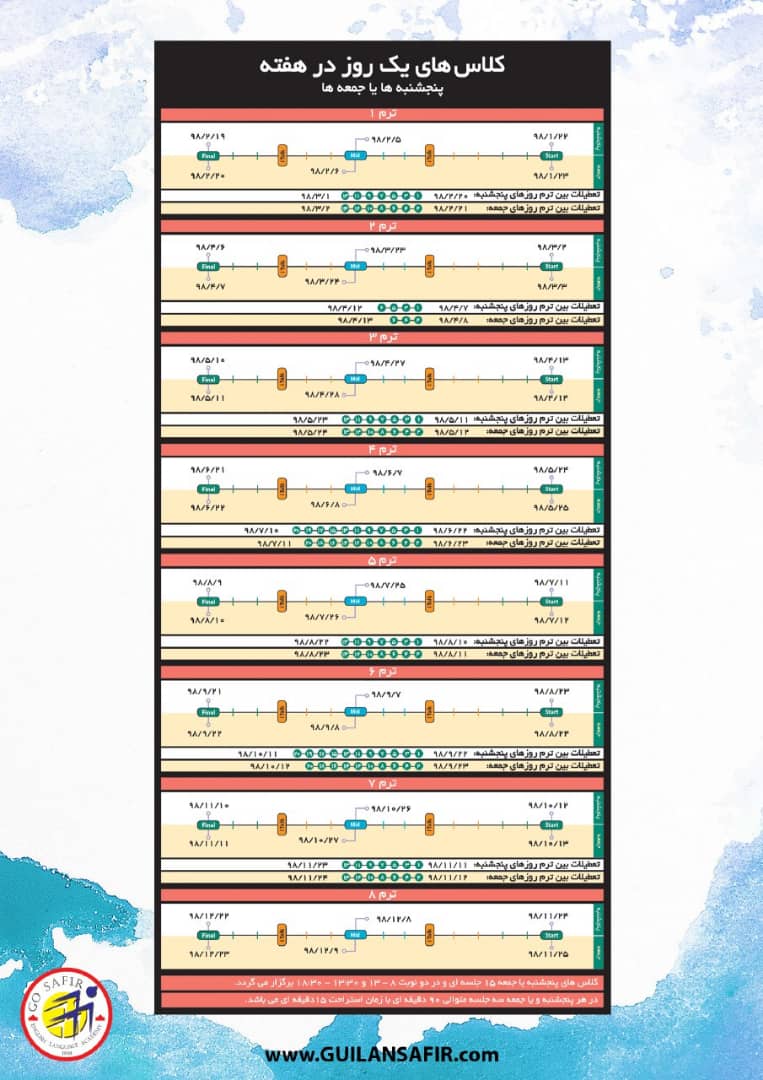 کلاسهای یک روز در هفته، پنجشنبه ها و یا جمعه ها صبح و یا بعد از ظهر به صورت سه جلسه ۹۰ دقیقه ای برگزار میشوند و هر ترم در پنج هفته به پایان میرسد.